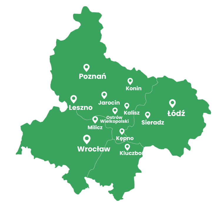 Działamy na terenie województwa dolnośląskiego, opolskiego, łódzkiego, południowej i środkowej wielkopolski. Dojeżdżamy do 150 km od Ostrowa Wielkopolskiego, gdzie znajduje się nasza siedziba.